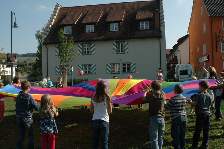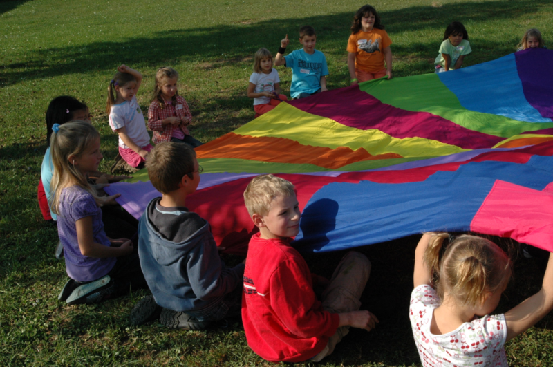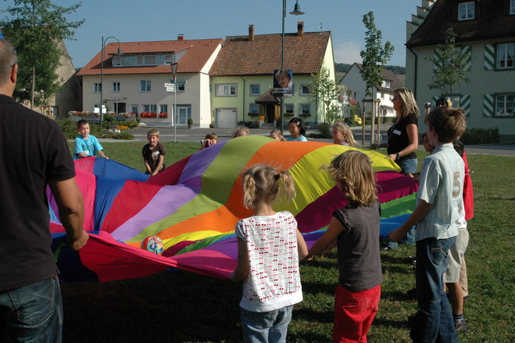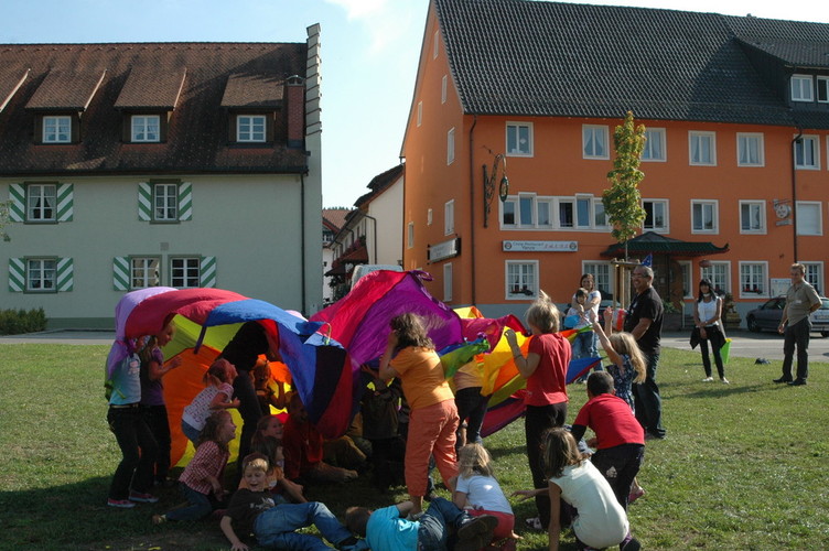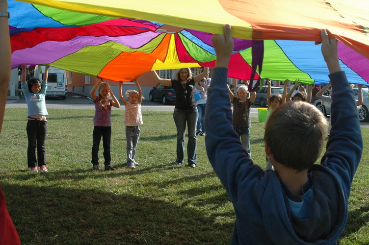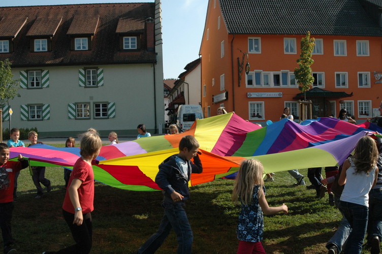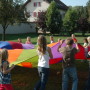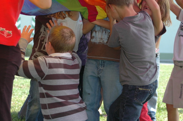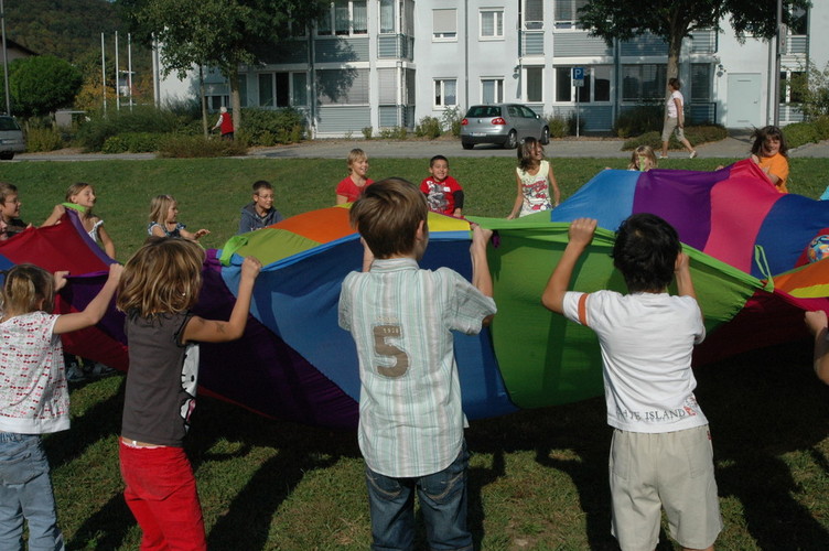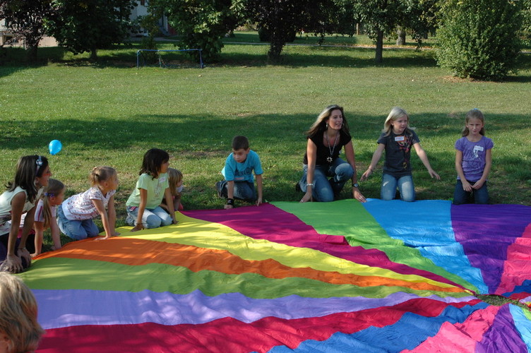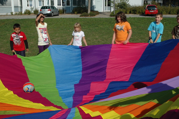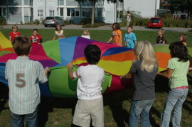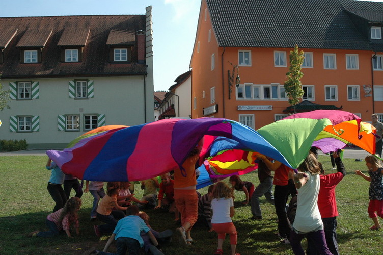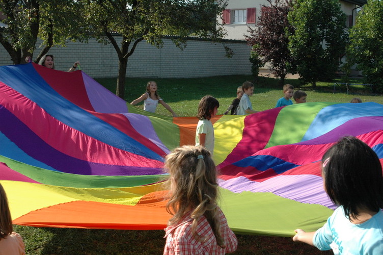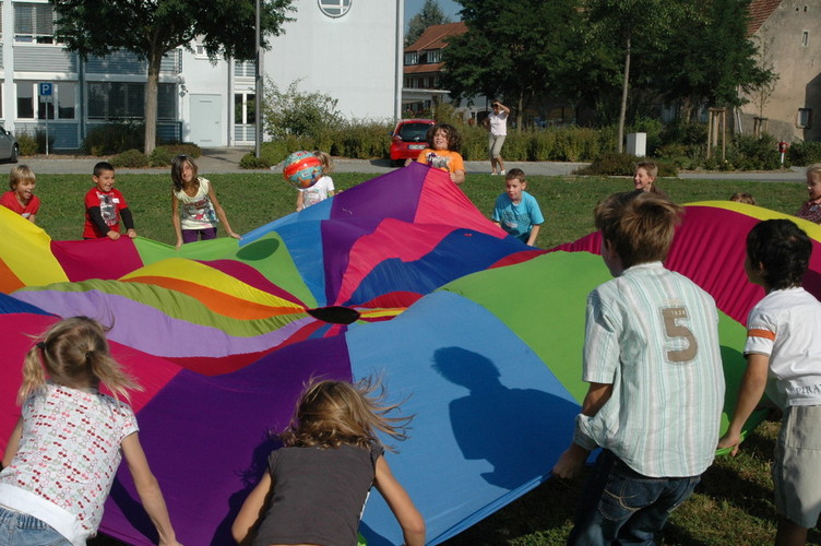Bei Spielen mit dem Schwungtuch werden ständig neue Bewegungsimpulse und aktive Spielideen herausgefordert.