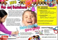 Mit viel Fantasie, Freude und Kreativität treffen wir uns zum gemeinsamen Malen, Pinseln, Klecksen, Basteln, Werken und zaubern tolle Kunstwerke auf Papier, Leinwand, Holz und auf alles, was uns